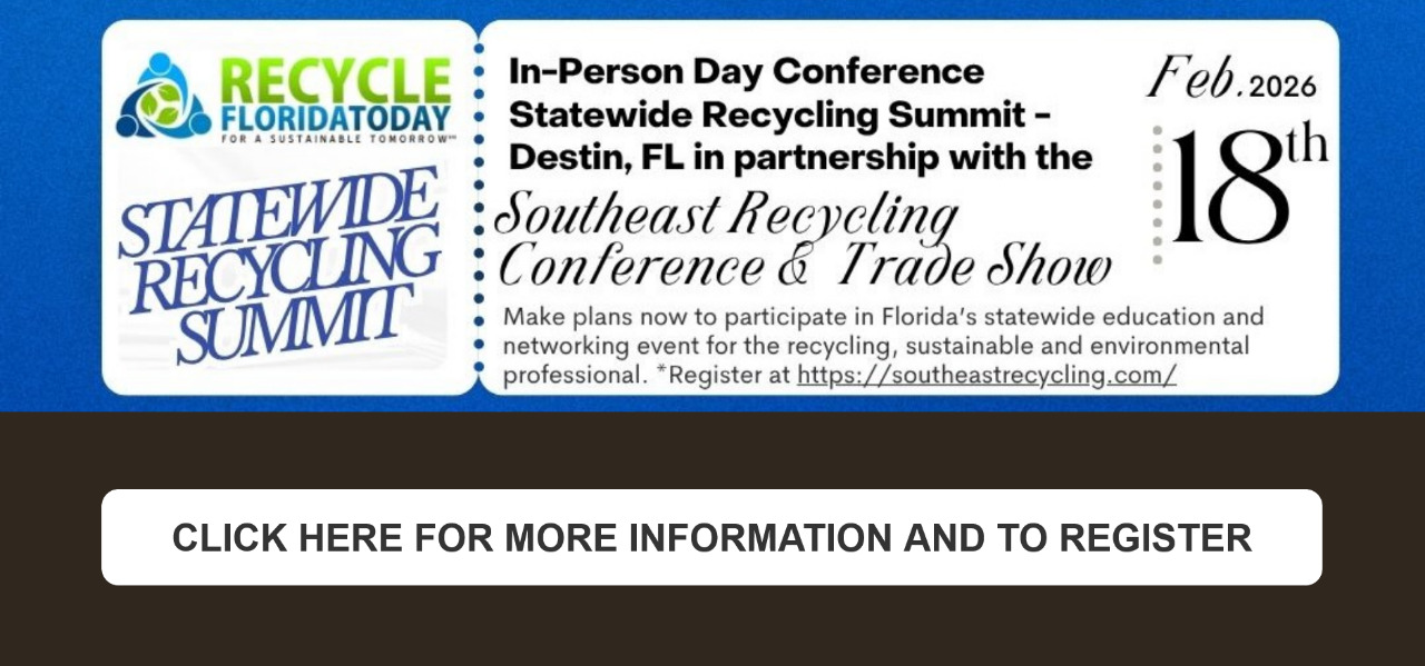 Recycle Florida Today, Inc. (RFT) is Florida’s state recycling organization and premier association representing recycling and environmental professionals throughout Florida from the public, private non-profit, and institutional sectors. RFT was formed to be a driving force to help Florida implement its recycling goals and objectives. RFT continues to provide educational and networking opportunities about recycling for all Floridians as well as support to local and state elected officials on laws and regulations affecting the recycling industry.