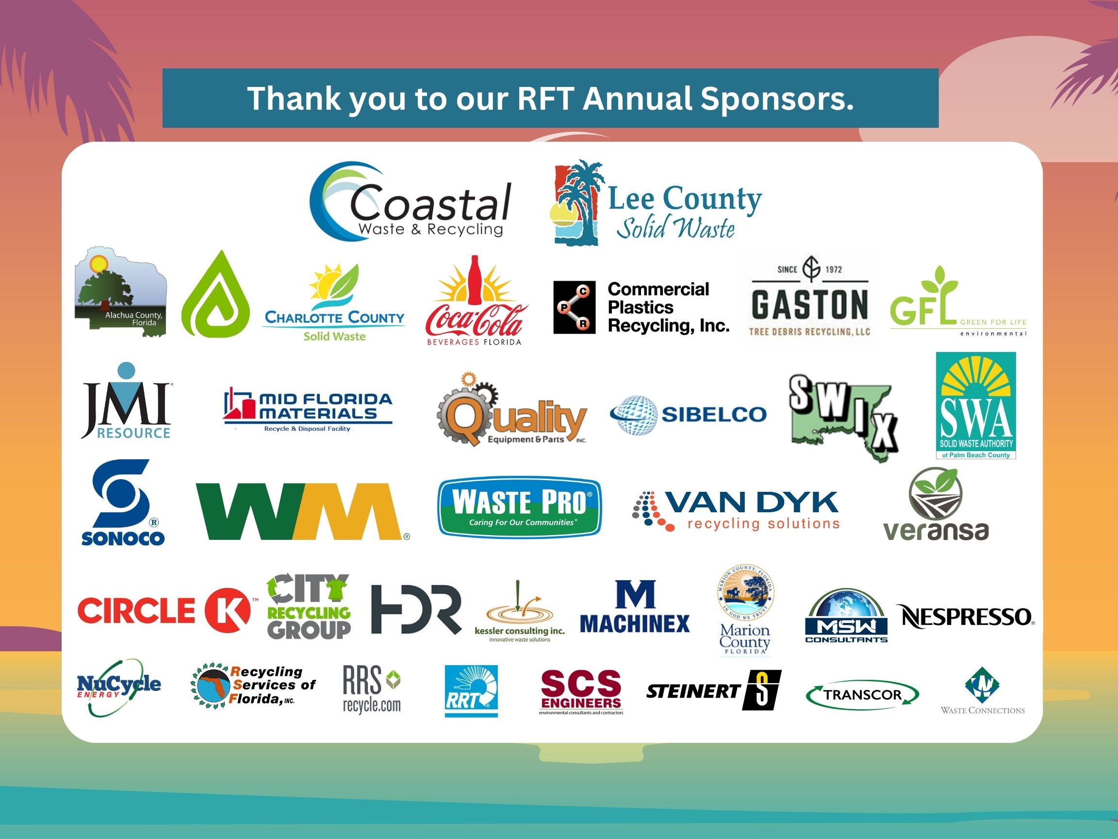Recycle Florida Today, Inc. (RFT) is Florida’s state recycling organization and premier association representing recycling and environmental professionals throughout Florida from the public, private non-profit, and institutional sectors. RFT was formed to be a driving force to help Florida implement its recycling goals and objectives. RFT continues to provide educational and networking opportunities about recycling for all Floridians as well as support to local and state elected officials on laws and regulations affecting the recycling industry.