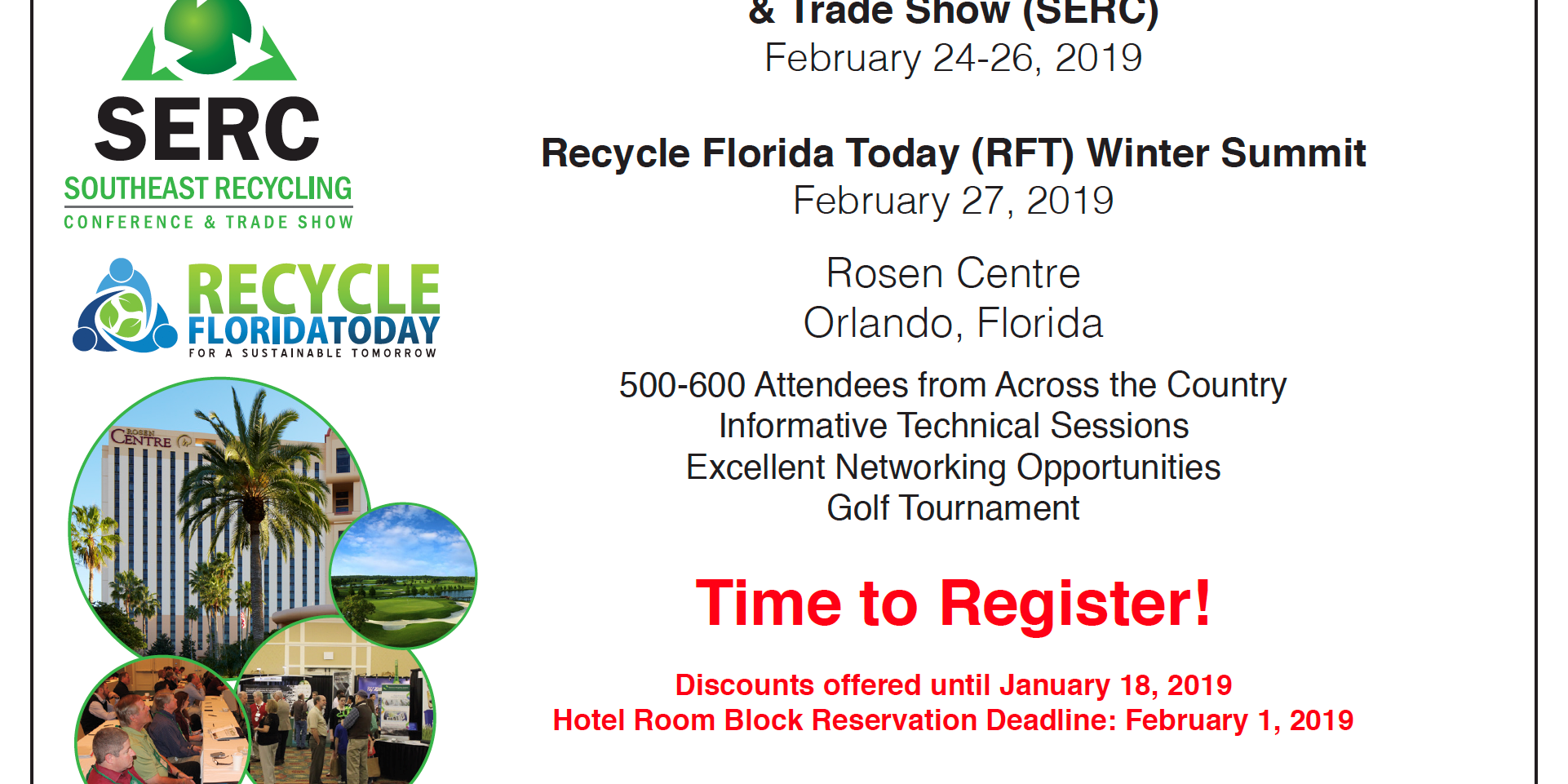 If you cannot attend, written notification must be received at least 10 working days prior to the conference. You may either send a substitute or receive a refund minus a $75.00 processing fee if your request is received before February 14, 2019. No refunds will be granted after the February 14, 2019 notice period for any reason. In the event of bad weather or if the conference is cancelled, the Southeast Recycling Conference (SERC) or Recycle Florida Today, Inc. (RFT) is not responsible for nonrefundable travel fares or lodging, nor will SERC or Recycle Florida Today, Inc. (RFT) issue refunds for registrations, exhibits, sponsorships, event activities or any associated fees.