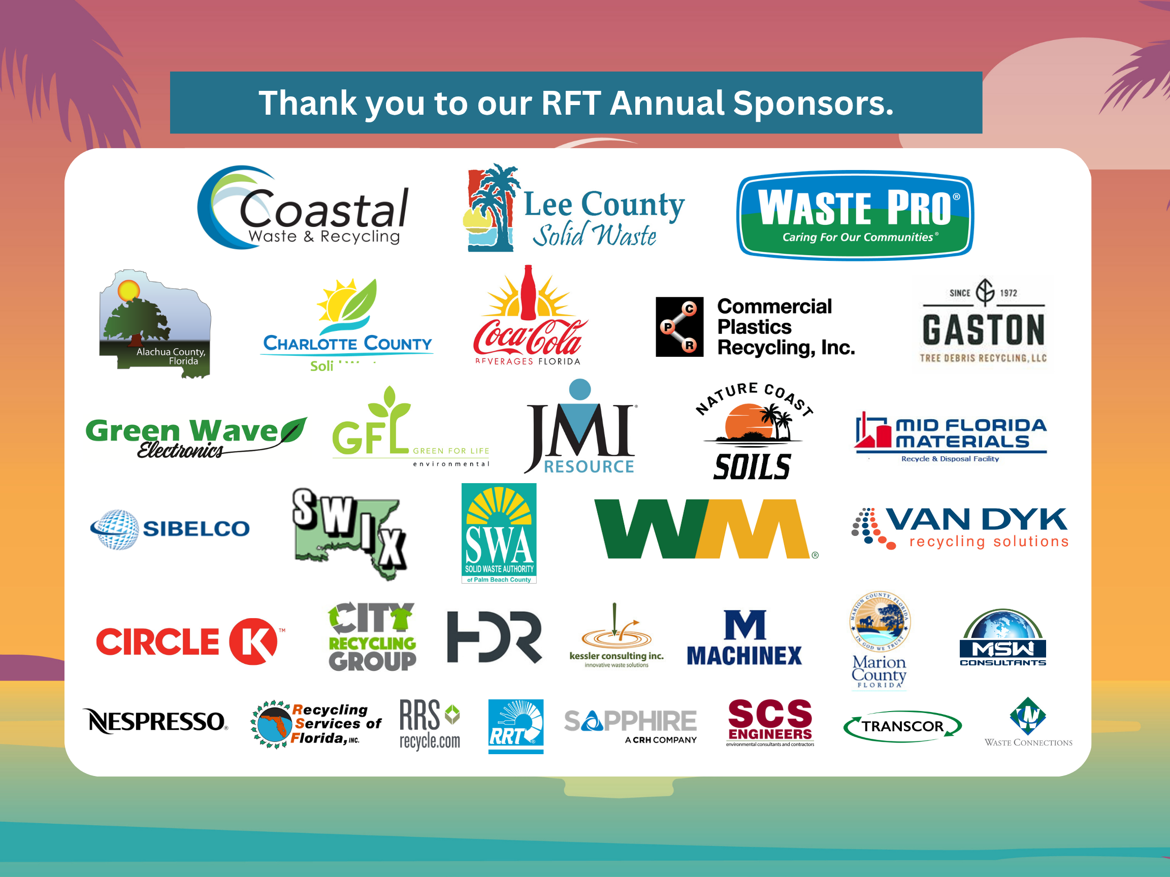 Networking breaks include: Continental breakfast, one (1) refreshment break, one (1) evening reception, one (1) luncheon, and one (1) networking dinner. *Those who register at the non-member rate will receive membership to Recycle Florida Today, Inc. for the remainder of the year. Memberships expire on December 31st of each year. Registrants may also participate virtually.