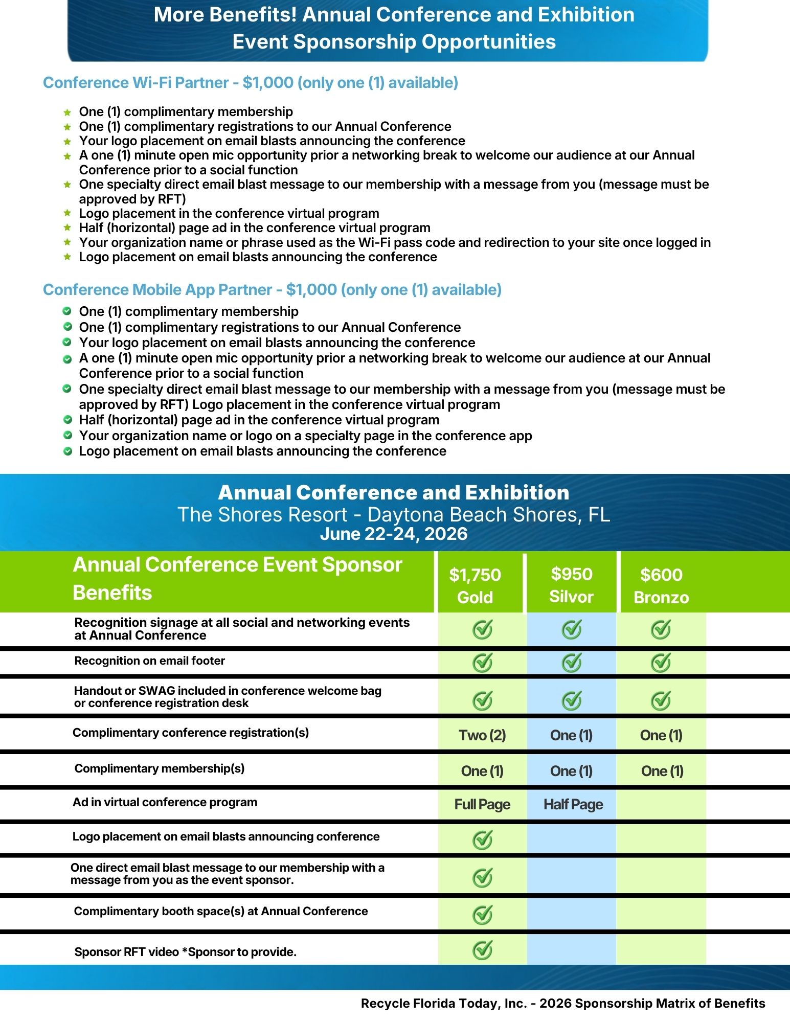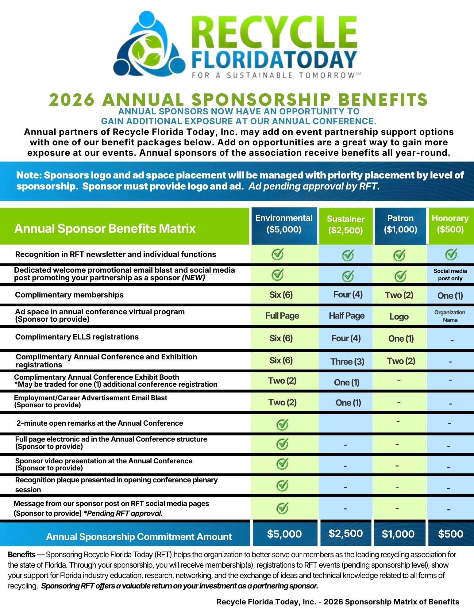 Recognition — Our sponsors receive recognition at all RFT events, are featured on our association website and members only area, and have an opportunity to be showcased as sponsor of the month. Sponsors are included on association e-mails that reach thousands annually, are provided with multiple industry-related contacts, networking opportunities, and more. It’s a great opportunity to show your support! We offer a range of opportunities to join RFT as an annual sponsor with a diverse list of benefits. If you would like more information on how you can partner with Florida’s leading recycling association, please contact RFT at (850) 907-1278 for more information.